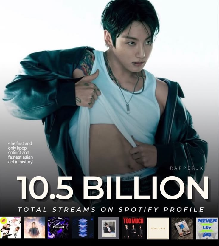 The Jungkook solo era didn't just make noise at release it built a legacy on streaming platforms that has only grown since. In September 2024, Jungkook became the first and only South Korean soloist to surpass 10.5 billion streams across all credits on Spotify. (t2ONLINE)